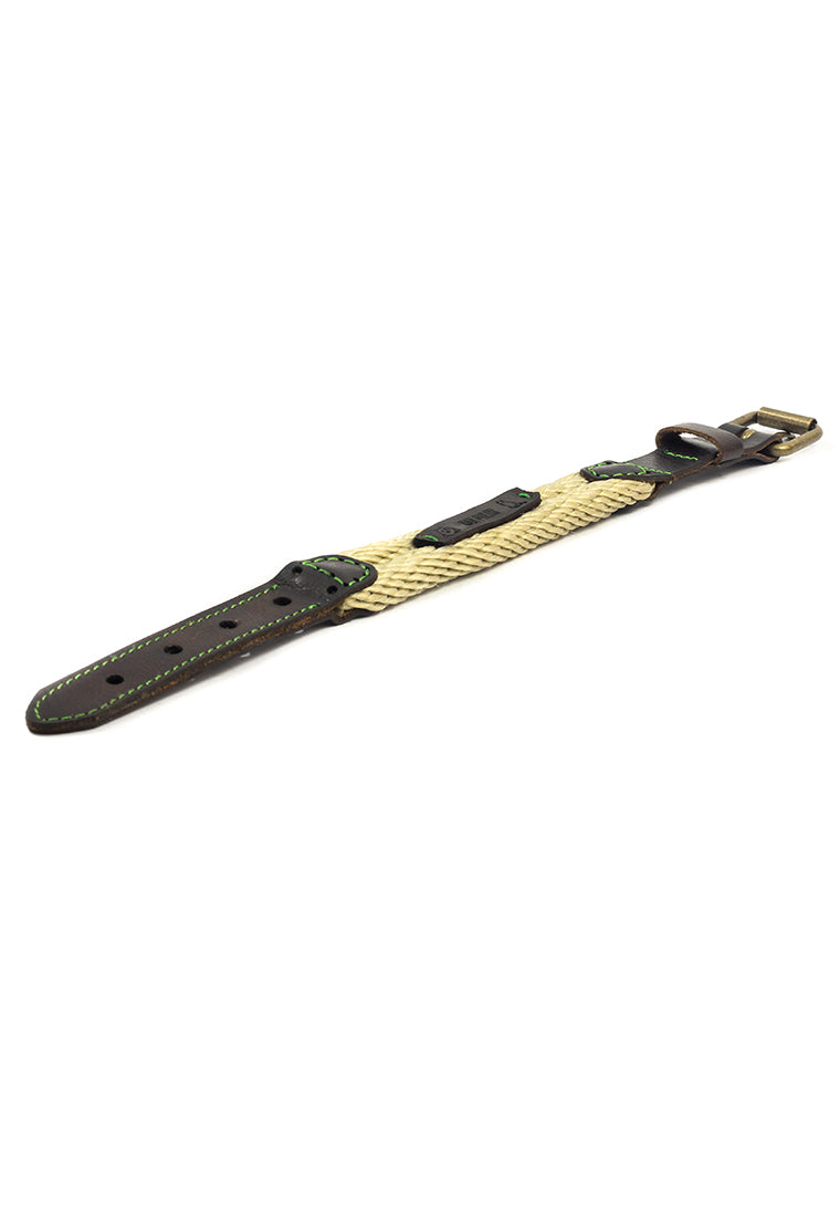 - Diseño Sofisticado: El tono beige se realza con costuras decorativas en verde y una elegante hebilla metálica con acabado cepillado (brush).